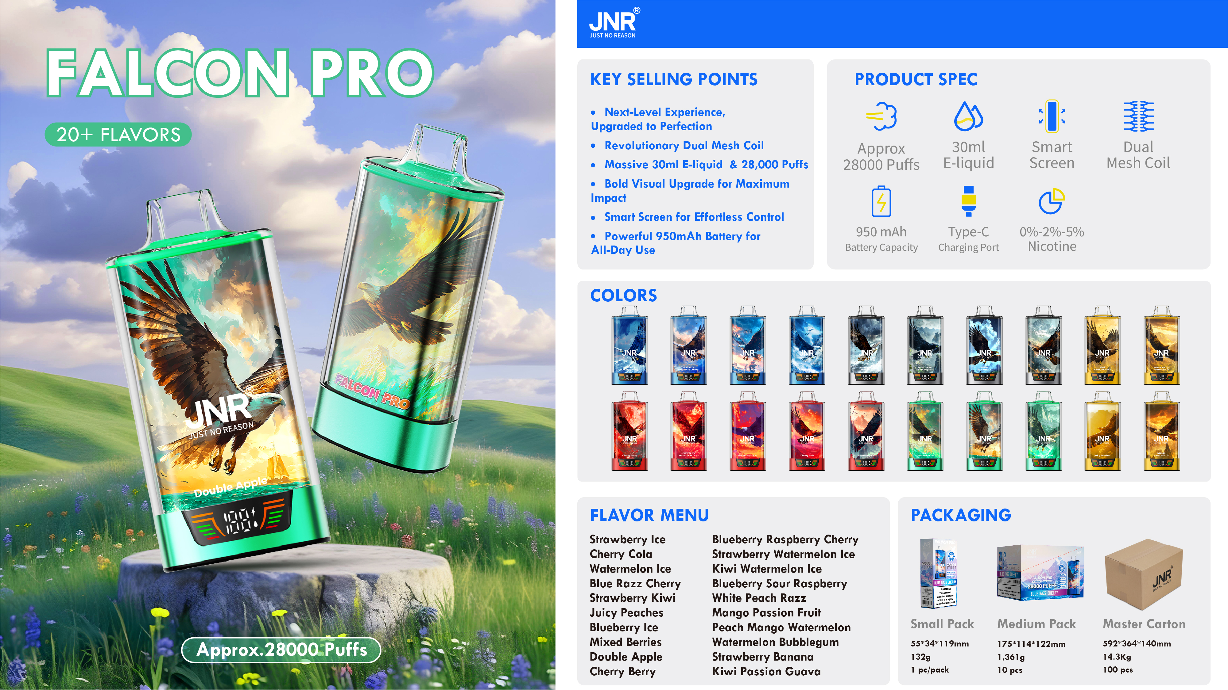 A JNR Falcon Pro 28K slukkos eldobható vape komoly felhasználóknak készült, akik mind a teljesítményt, mind az erőt elvárják. A lenyűgöző, akár 28 000 slukkos kapacitás révén ez a prémium eldobható készülék erőteljes ízt és kielégítő torokérzetet nyújt, amely hosszú ideig tart. A készülék előre feltöltött, nagy, 30 ml-es e-liquid-tel érkezik, így hosszú használatot biztosít újratöltés nélkül — ideális azok számára, akik nem szeretik a megszakításokat.